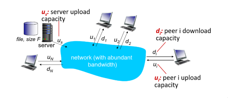 - (Peer Bottleneck): Each peer must download one full copy of the file from the network, so the peer with the slowest download rate () limits the distribution time.
