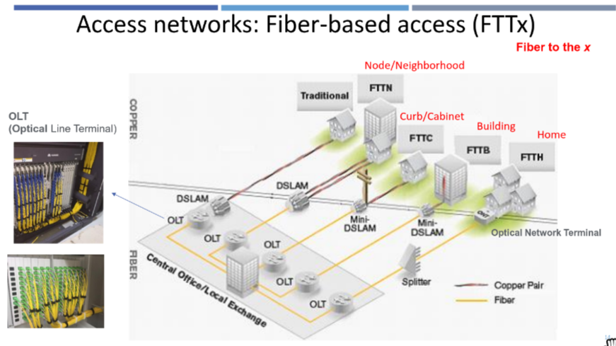 - Optical Line Terminal (OLT) → Digital Subscriber Line Access Multiplexer (DSLAM) → user’s home