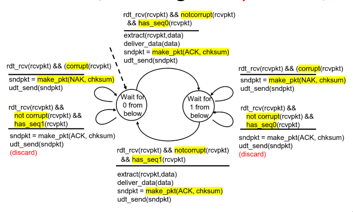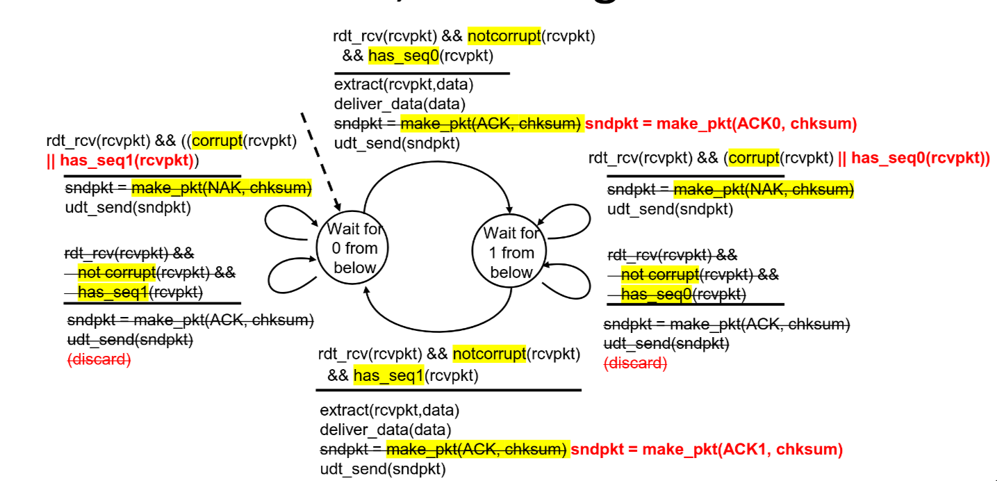 - In case that ACK/NAK corrupted, sender retransmits packet, but receiver discards duplicate packets.