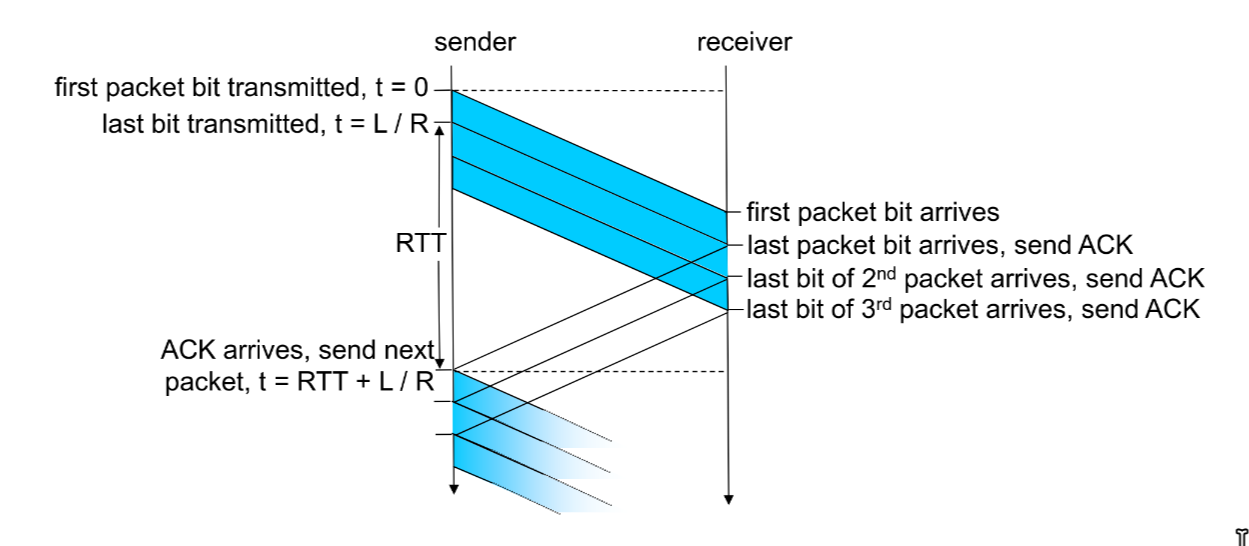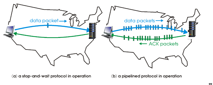 - pipelining: sender allows multiple “in-flight” yet-to-be-ACKed packets